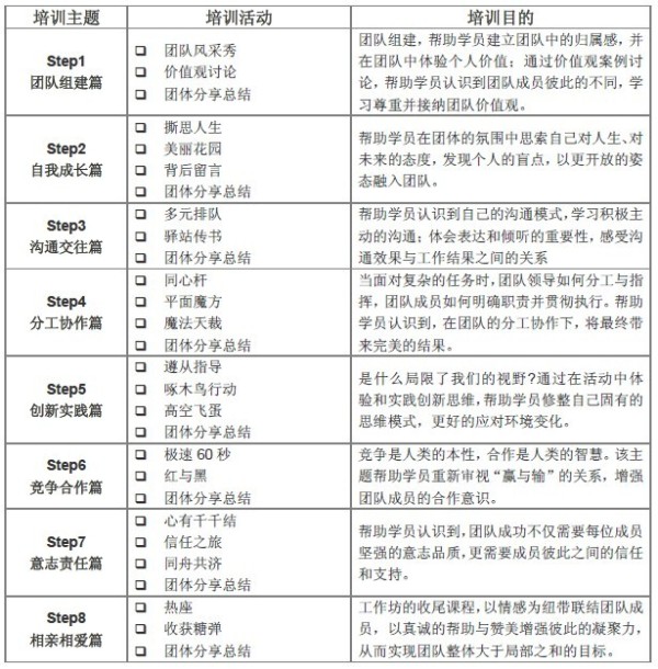 * 伴随成长:传统的集中式培训,学员在短时间内接收了大量的信息,拓展了原有的思维模式,但由于缺乏持续的跟进和强化,培训效果随着时间的推移而 下降。因此,团队建设的培训需要伴随团队的成长持续推进。在团体中学习,在工作中反思,在团体中领悟,在工作中应用,并最终通过日常与团队的共同工作,在 群体压力下形成新的习惯。