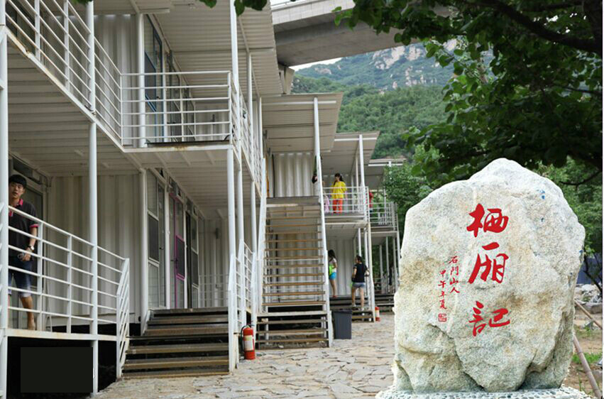 沿着右手方向继续前行,就看到了石门山别具一格的住宿区域,石门山的住宿区全部是由集装箱叠加、改造、分割、装修而成,共 节车厢 客房,可供 人同时住宿。同时它有一个非常别致的名字,叫做栖厢记。既切合了用集装箱改作住房的实际,又一下子令人想到崔莺莺待月西厢记那个脍炙人口的爱情故事,陡然生出无限的绮念霞思。