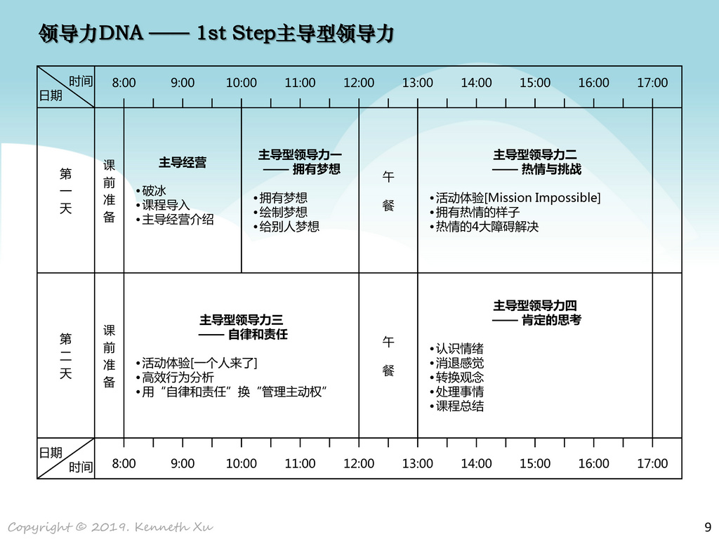 《领导力DNA》系列课程就是针对上述问题开发的,从提升个人内驱力开始,对于人才的培养应分阶段有体系的进行,稳定持续的进行培训,效果会在企业的经营中逐渐的展示出来。