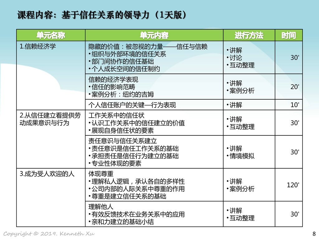 ③开诚布公。人们所不知道的和人们所知道的都可能导致不信任。如果你开诚布公,就可能带来信心和信任。因此,应该让人们充分了解信息,解释你作出某项决策的原因,对于现存问题则坦诚相告,并充分展示与之相关的信息;
